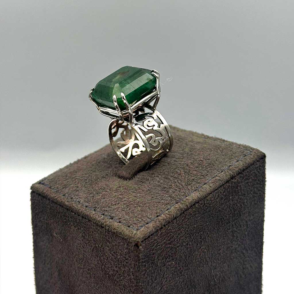 A white gold ring adorned with a natural emerald gemstone, engraved with the royal Quranic supplication